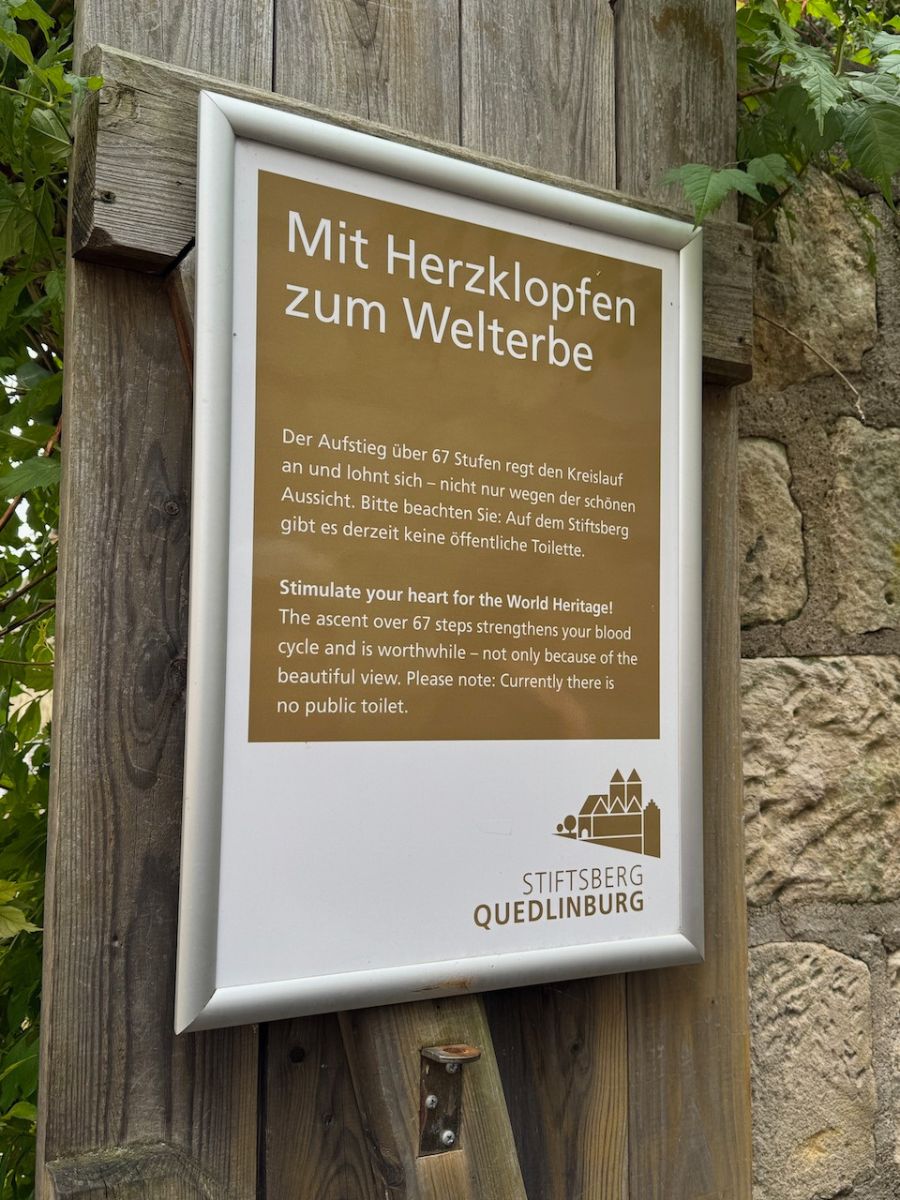 Am Nachmittag besichtigten wir die Stiftskirche St. Servatius auf dem Schlossberg mit ihrem berühmten Domschatz. Bevor wir sie allerdings besichtigen konnten, mussten wir in Summe 97 Treppen bis ganz nach oben hochsteigen. Die Belohnung war ein schöner Blick über Quedlinburg und dem Garten. Die Grabstätte von Heinrich I. ist leer – bis heute weiß man nicht, wo seine Gebeine liegen.
