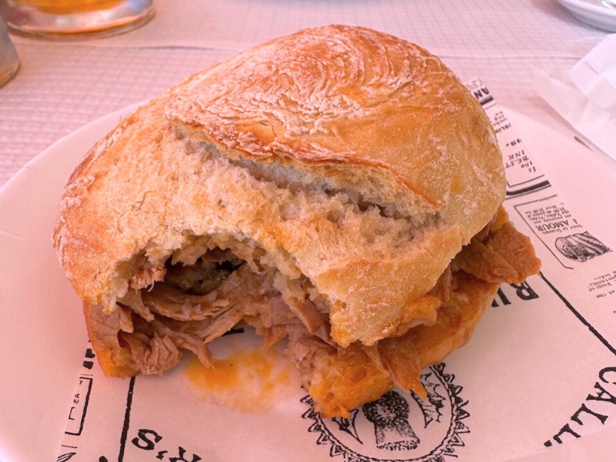 Mittagessen in Nazaré – Bifana (Schnitzel mit leckerer Sauce im Brötchen) mit kühlem Bier, einfach gut.