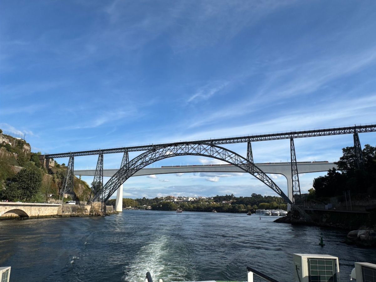Wir fuhren mit dem Bus entlang des Douros östlich bis zur Anlegestelle Peso da Régua. Dort wartete schon das Schiff. Die Fahrt ging um 10.30 h los und wir konnten vom Fluss aus das Ufer mit seiner Landschaft und Örtchen vorbeiziehen sehen. Das Douro Tal ist vom Weinanbau geprägt, dort wird schon seit Jahrhunderten auf Terrassen die Trauben für die Weine und dem leckeren Portwein angebaut. Kurz nach dem Mittagessen kam ein Highlight der Fahrt, das Schleusen mit einer Höhe von 34 Metern! Sehr imposant und auch sehr schnell ging es abwärts zum nächsten Abschnitt des Douros. Der Nachmittag plätscherte so dahin, wir ließen die Seelen baumeln, führten schöne Gespräche und genossen die letzten Sonnenstrahlen vor dem Herbstwetter in Deutschland. Immerhin hatten wir 28 Grad! Dann kam die zweite Schleuse und bald darauf waren die Brücken von Porto zu sehen. Das war ein schöner Blick auf die verschiedenen Architekturen der Brücken und zum Schluss landeten wir wieder am Cais de Ribeira an, den wir gestern zu Fuß erkundet hatten.
