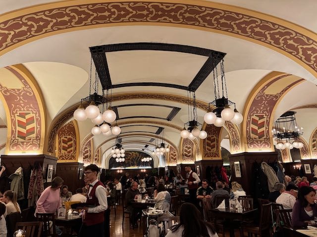 Mit müden Füßen, aber glücklich, kamen wir gegen 18:30 Uhr zurück ins Apartment, frisch gemacht – und dann auf zum Auerbachkeller, ein absolutes Muss in Leipzig. Ja, es ist laut, aber die historische Atmosphäre mit den bemalten Decken ist einmalig. Danach ließen wir den Abend wieder ganz gemütlich bei Stricken und Wein auf dem Sofa ausklingen.